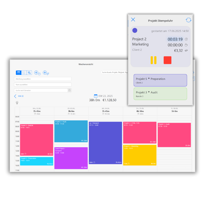Mobile und stationäre Arbeits- und Projektzeiterfassung für große Teams. Mit TimeTrack kannst du alle Projektaufwände erfassen und mit einem Klick eine Rechnung in Lexware Office erstellen.