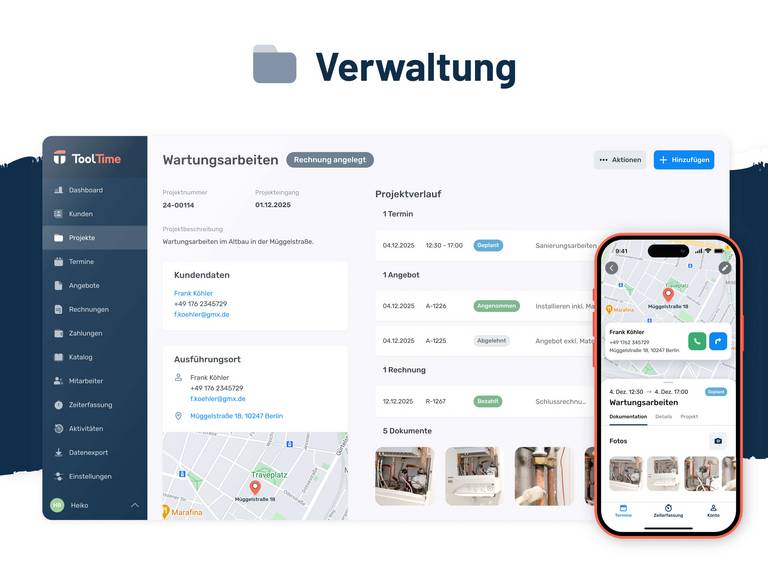 ToolTime ermöglicht Dir, Deine Projekte von der ersten Kundenanfrage bis zur Abrechnung komplett digital zu verwalten. Mit Hilfe der Handwerkersoftware behältst Du stets den Überblick über alle Aufträge und Dokumente – kein Suchen, kein Chaos.
