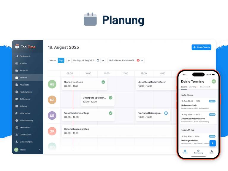 Plane Einsätze per Drag-and-Drop, erstelle Termine direkt in der Software und informiere Dein Team automatisch per App. So werden Missverständnisse vermieden, und jeder weiß genau, wann und wo er gebraucht wird.