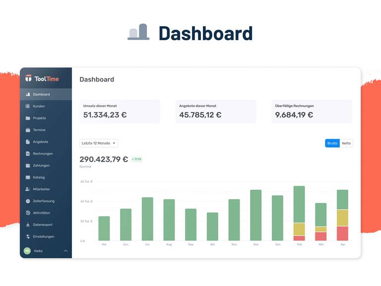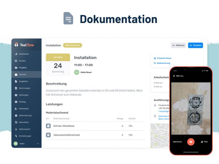 ToolTime ist die Handwerkersoftware, die Büroarbeit einfacher macht. Mit Zeiterfassung, Baustellendokumentation, Rechnungsstellung und ToolTime Pay – dem ersten integrierten Zahlungssystem für Handwerker – digitalisiert und optimiert ToolTime Deinen Betrieb. Dank Cloud-Technologie hast Du jederzeit und überall Zugriff – im Büro und auf der Baustelle.