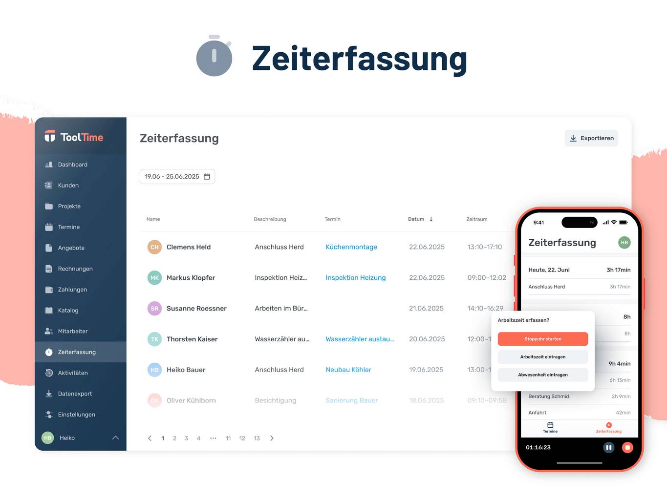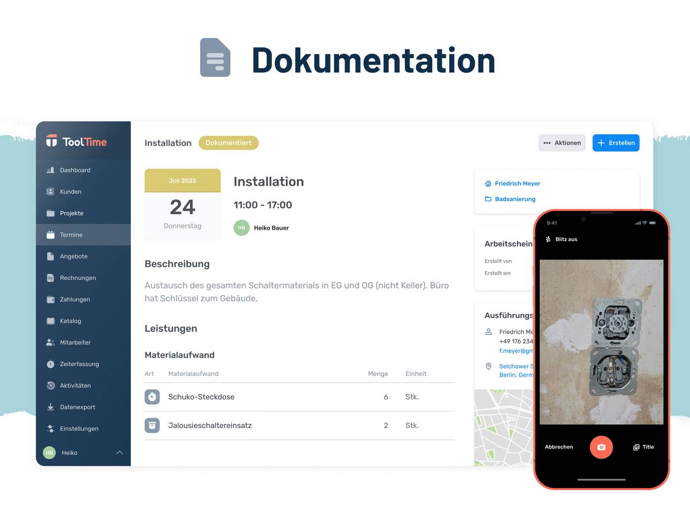 ToolTime ist die cloudbasierte Handwerkersoftware mit mobiler App, die Deinen Betrieb bei der Digitalisierung unterstützt - von der Zeiterfassung, mobilen Baustellendokumentation bis zur Rechnungsstellung, inklusive integriertem Zahlungssystem.