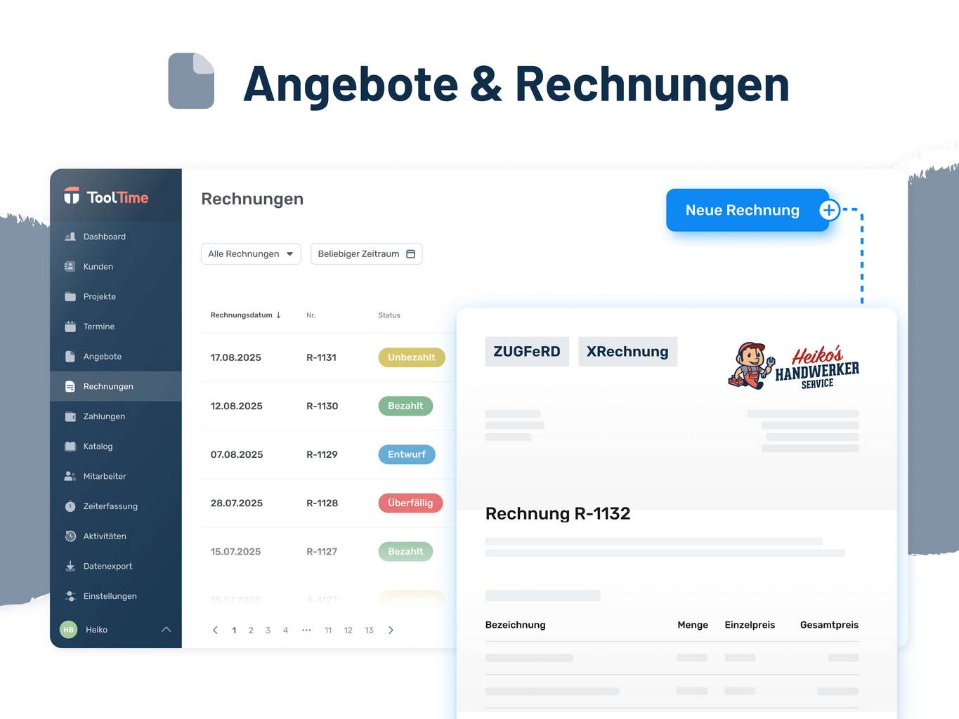 Mit ToolTime Pay wird die Zahlungsabwicklung effizient und stressfrei: Deine Kunden können zwischen modernen Zahlungsmethoden auswählen, die Zahlungseingänge werden automatisch erfasst und gegebenenfalls Mahnungen verschickt. Damit ist ToolTime die einzige Software für Handwerker, die ein voll integriertes Zahlungssystem bietet.