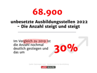 Im vergangenen Jahr blieben in Deutschland 68.900 Ausbildungsplätze unbesetzt, ein Anstieg um 30 Prozent im Vergleich zu 2019. Dies verschärft nicht nur den Fachkräftemangel in Kleinst-, Klein- und mittleren Unternehmen (37 Prozent unbesetzte Stellen), sondern beeinträchtigt auch die Kunden, da Aufträge verzögert oder abgelehnt werden.