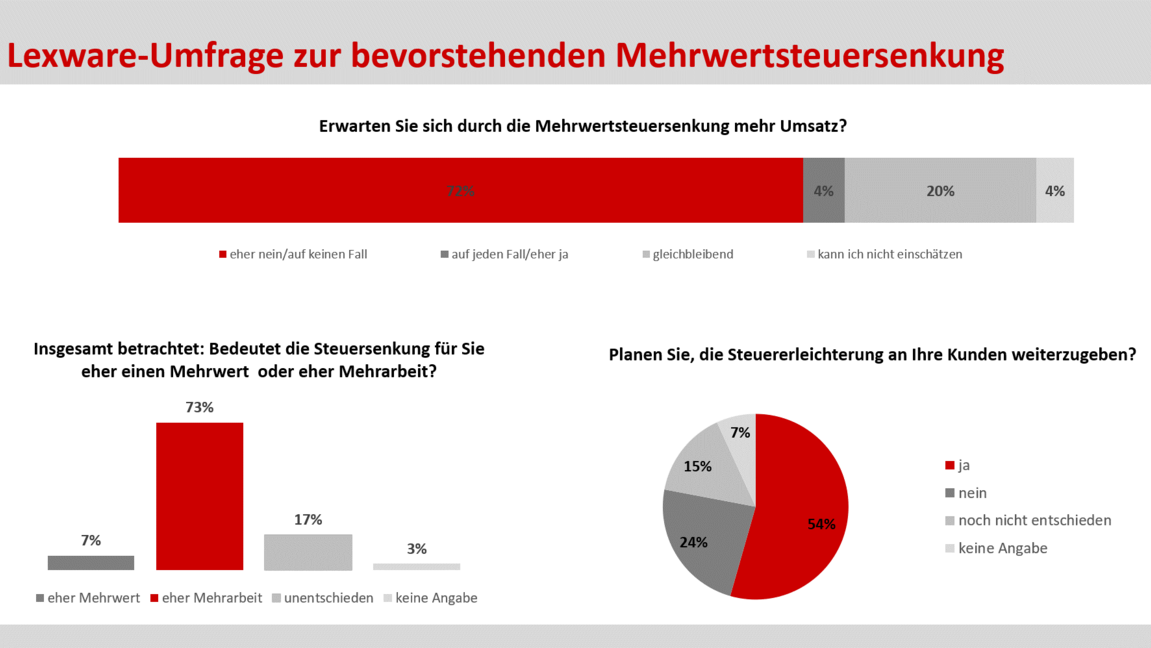 Softwarehersteller Lexware hat die Mehrwertsteueränderung zum Anlass genommen und zwischen dem 19. und 24. Juni die eigene Zielgruppe dazu befragt. 8.355 Unternehmer*innen haben an der Befragung teilgenommen. Die Ergebnisse fallen deutlich aus: Mehr als zwei Drittel (71,6 Prozent) der Befragten gaben an, auf keinen Fall bzw. eher nicht mit zusätzlichem Umsatz zu rechnen. Im Vergleich dazu gehen nur 4,4 Prozent der Unternehmen von einem Umsatzzuwachs aus. Alles in allem betrachten sieben von zehn Befragten (72,7 Prozent) die Steueranpassung als Mehrarbeit. Vor allem Kassensysteme, Preisschilder und -listen sowie Shop- und Buchhaltungssysteme müssen kurzfristig und zeitlich begrenzt angepasst werden. Dennoch wollen mehr als die Hälfte aller Befragten (54,4 Prozent) die Steuererleichterung an ihre Kund*innen weitergeben. Weitere 15 Prozent waren zur Zeit der Befragung diesbezüglich noch unentschieden.