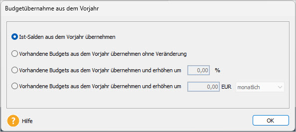 - Falls Sie mit der Budgetverwaltung arbeiten, wählen Sie jetzt die Art der Übernahme der Budgetwerte aus dem Vorjahr.