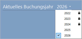 Um Belege im Vorjahr zu buchen, wechseln Sie über die Jahresauswahl in das vorige Buchungsjahr.
