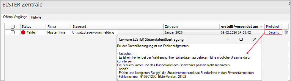 Das Fehlerprotokoll finden Sie auch in der ELSTER Zentrale in den 'Details'.