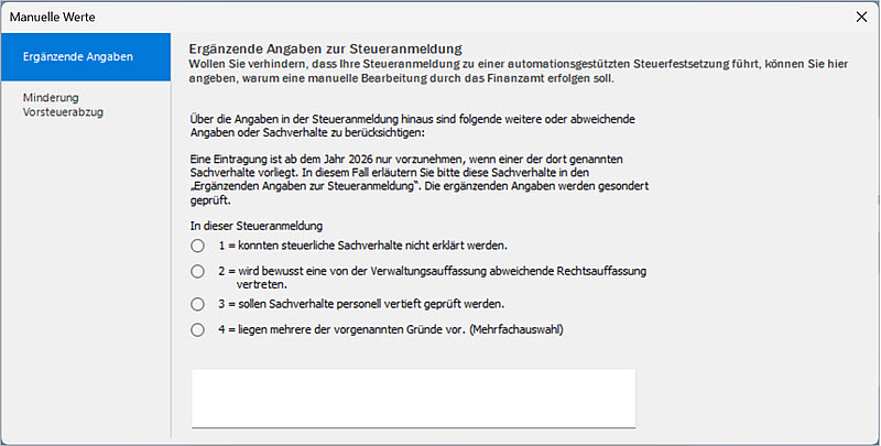 Um zu verhindern, dass Ihre Steueranmeldung zur automationsgestützen Steuerfestsetzung führt, geben Sie hier Ihre Gründe an.Neu ab Version 2026 mit Update Januar: Sie finden ab Buchungsjahr 2026 vier Standardangaben. Diese Daten werden in Kz 500 in Zeile 55 übertragen.