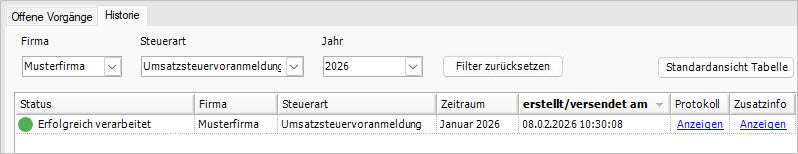 In dieser Registerkarte finden Sie die erfolgreich übertragenen Steuerdatenfälle mit Link zum Protokoll und der Zusatzinfo, z. B. Datenbereitsteller, Datenübermittler.