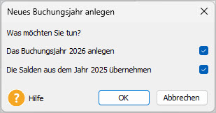 - Um das neue Jahr mit Saldenübernahme und Vortragsaktualisierung anzulegen, muss die Einstellung 'Die Salden ... übernehmen' angehakt sein.