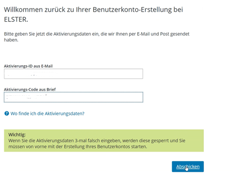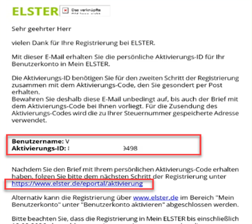 • Die Anlage des neuen Accounts schließen Sie durch einen Aktivierungscode, der Ihnen von ELSTER in einer Mail und einem Brief geschickt wird, ab.