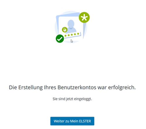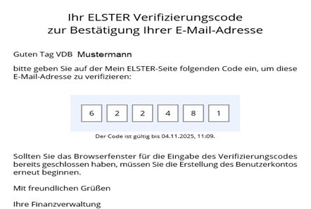 • Sie legen einen neuen Account an. Dabei müssen Sie die Gültigkeit Ihrer E-Mail-Adresse mit einem Verifizierungscode bestätigen, den Sie umgehend per E-Mail von ELSTER erhalten.