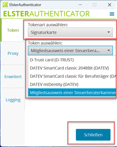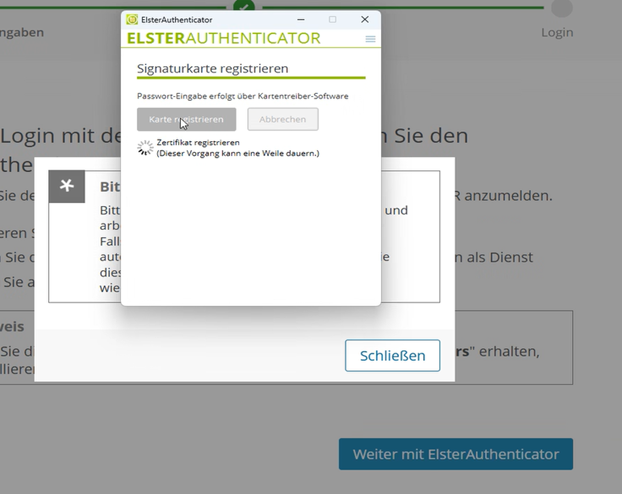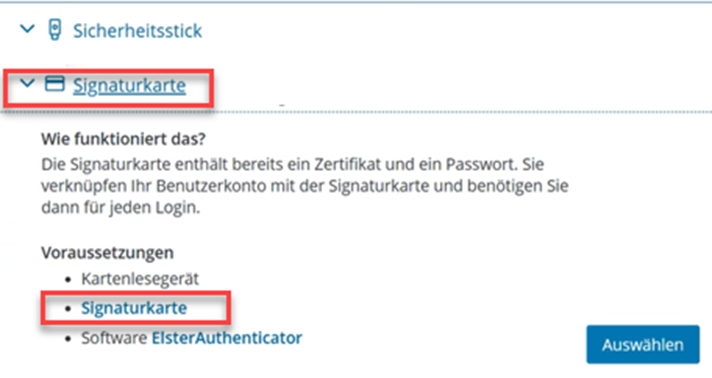 Damit Sie die Signaturkarte registrieren können muss im ELSTERAUTHENTIFIKATOR der Mitgliedausweis ausgewählt worden sein.