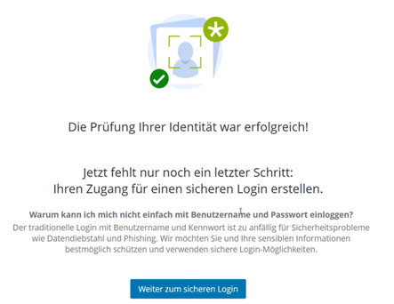• Es erscheint die Meldung, dass die Prüfung erfolgreich war und Sie klicken auf Weiter zum sicheren Login