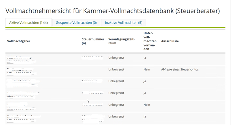 • In dieser Übersicht sollten jetzt Ihre Mandantenvollmachten aus der VDB angezeigt werden.
