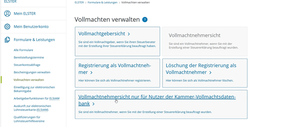 • Gehen auf Formulare und Leistungen und wählen dort Vollmachten verwalten