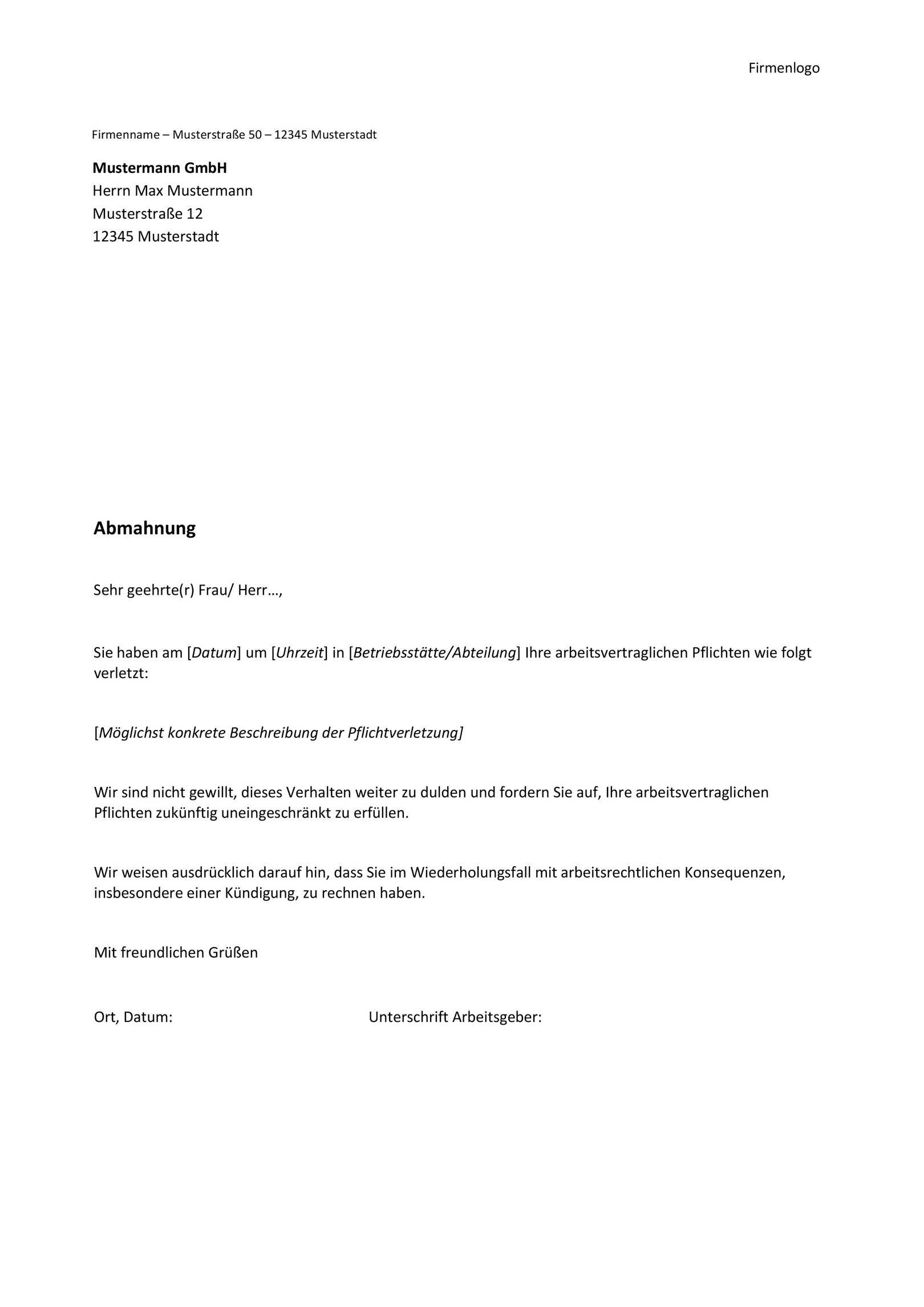 - Die Abmahnung hat in dieser offiziellen Form häufig bereits eine ausreichend abschreckende Wirkung. Damit Sie keine Zeit bei der Formulierung verlieren, können Sie das Abmahnungs-Musterschreiben individuell auf Ihre Mitarbeitenden zuschneiden.