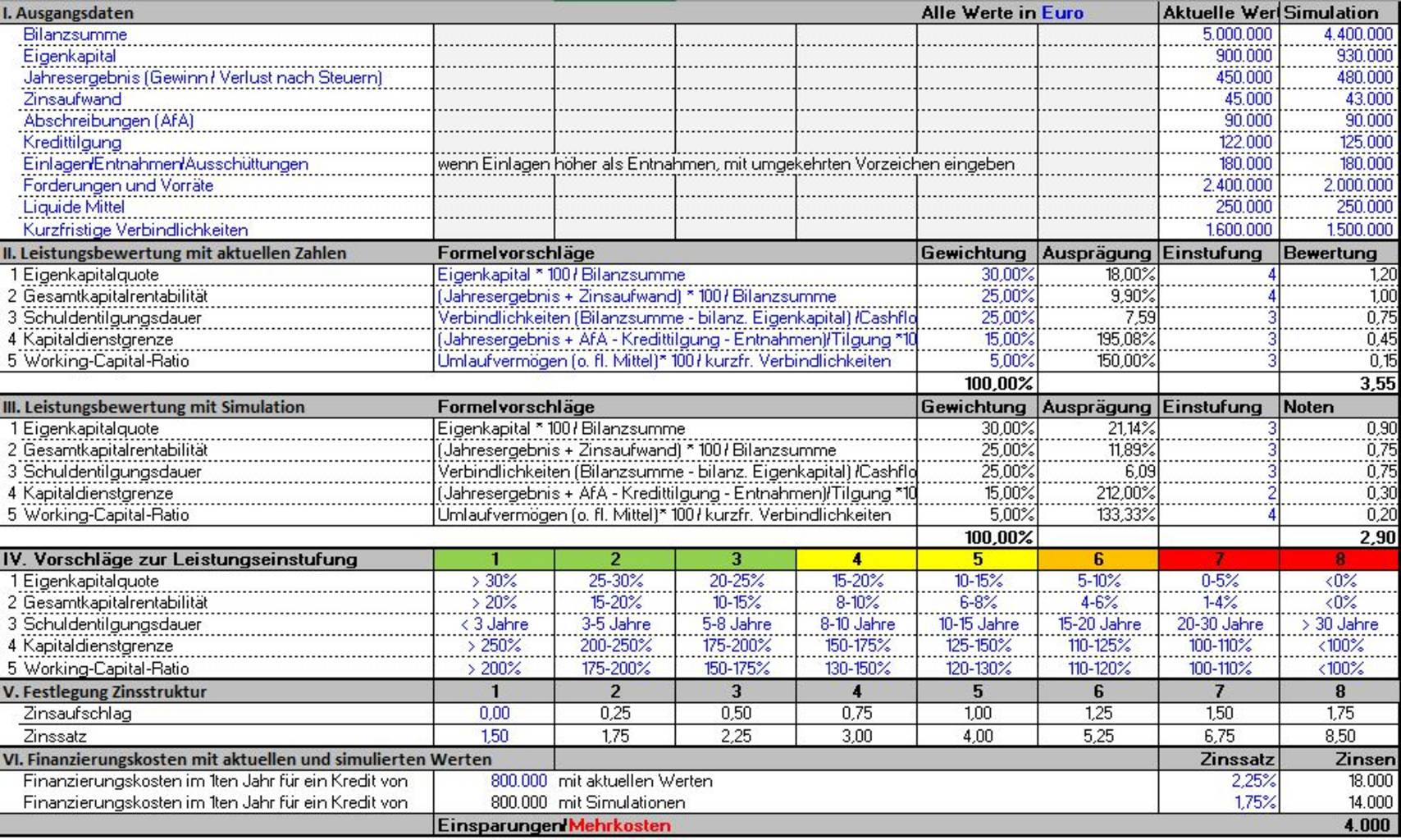 Das Beispiel zeigt auch, welche Auswirkungen Verbesserungen haben. Dort ist zu sehen, dass die Verbesserungen dazu führen, dass das Unternehmen in eine bessere Kategorie kommt und die Zinskosten damit gegenüber der aktuellen Lage um 4.000 Euro niedriger ausfallen.