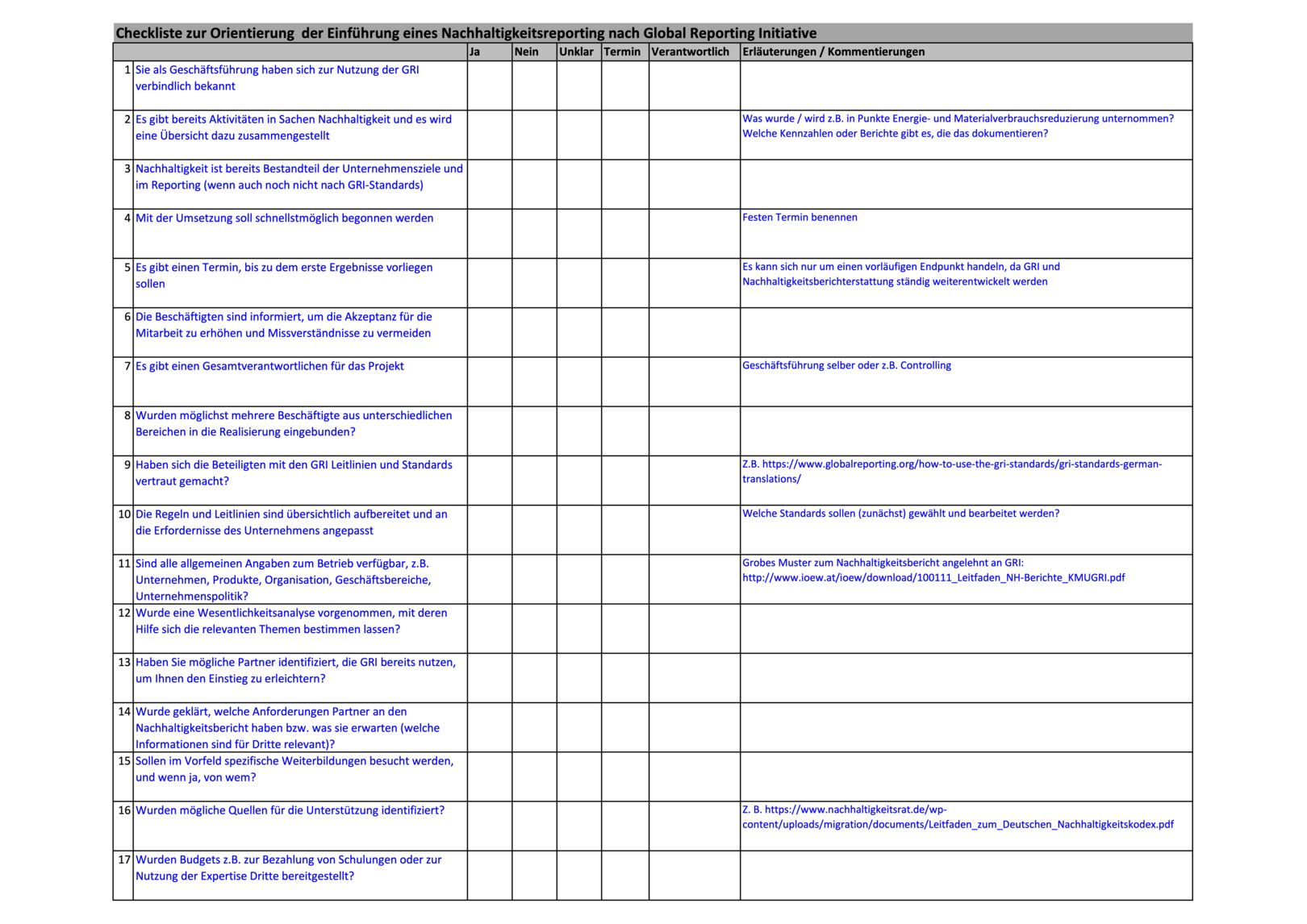 Der Umwelt- und Klimapakt Bayern stellt zudem einen Leitfaden für die Einführung von GRI bereit. Zudem gibt es ein Beispiel für einen (relativ alten) Leitfaden aus Österreich unter Kriterien / Indikatoren Nachhaltigkeitsbericht für KMU‘s, der an GRI angelehnt ist. Um vorab Know-how aufzubauen, bietet sich für beteiligte Personen im Unternehmen auch eine Fortbildung oder Schulung in diesem Bereich an.