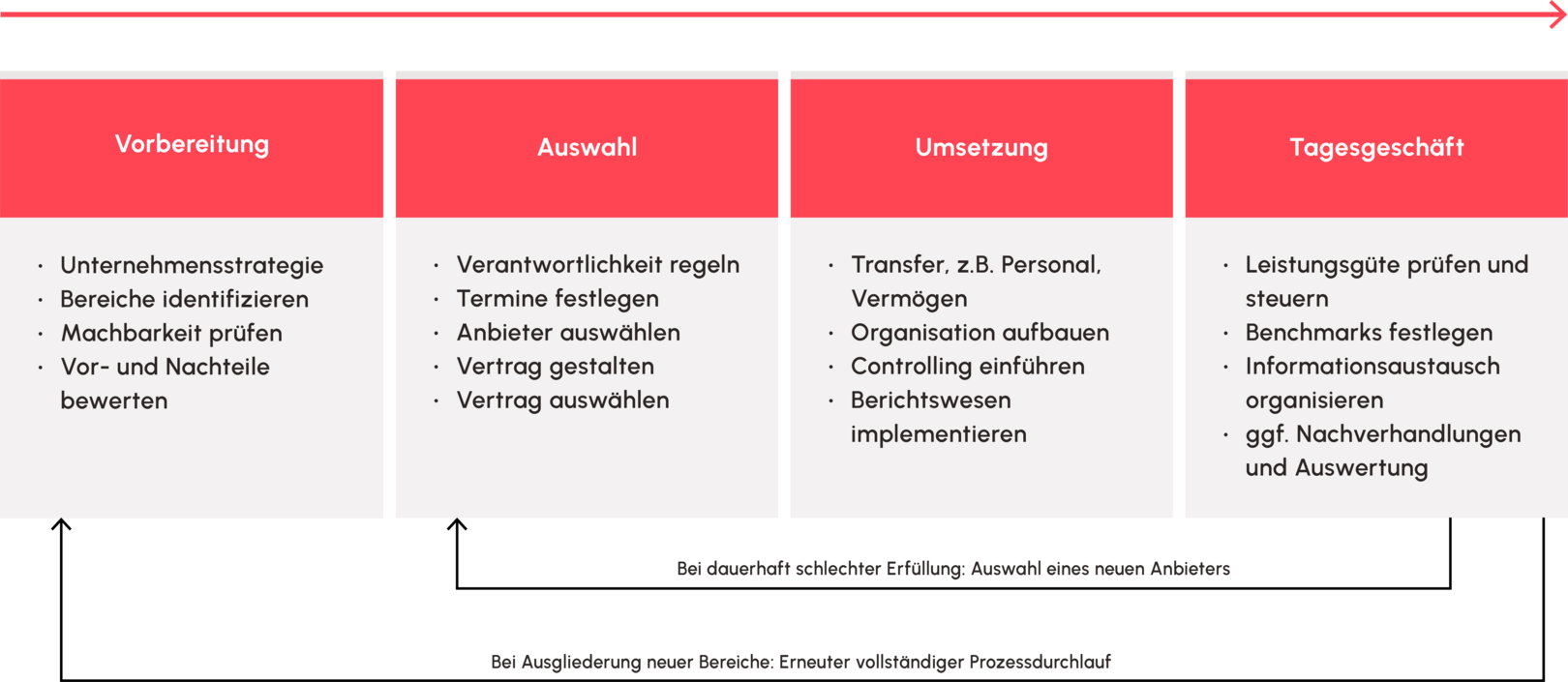 Um bestimmte Aufgaben und Prozesse effizient auslagern zu können, empfiehlt es sich, strukturiert zu agieren. Für ein erfolgreiches Outsourcing ist das richtige Vorgehen erforderlich. Halten Sie sich daher an folgende Schritte: