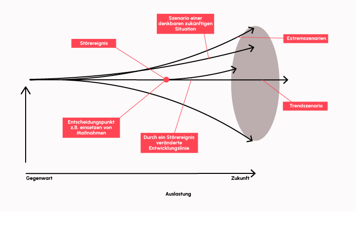 Je häufiger Störereignisse auftreten und je gravierender diese sind, desto stärker weicht die Entwicklung vom Trendszenario ab. Die Herausforderung für das Management besteht darin, auf solche Ereignisse schnell und zielgerichtet zu reagieren. Der Trichter wird durch ein positives und ein negatives Extremszenario begrenzt, die die jeweiligen Extrementwicklungen darstellen.